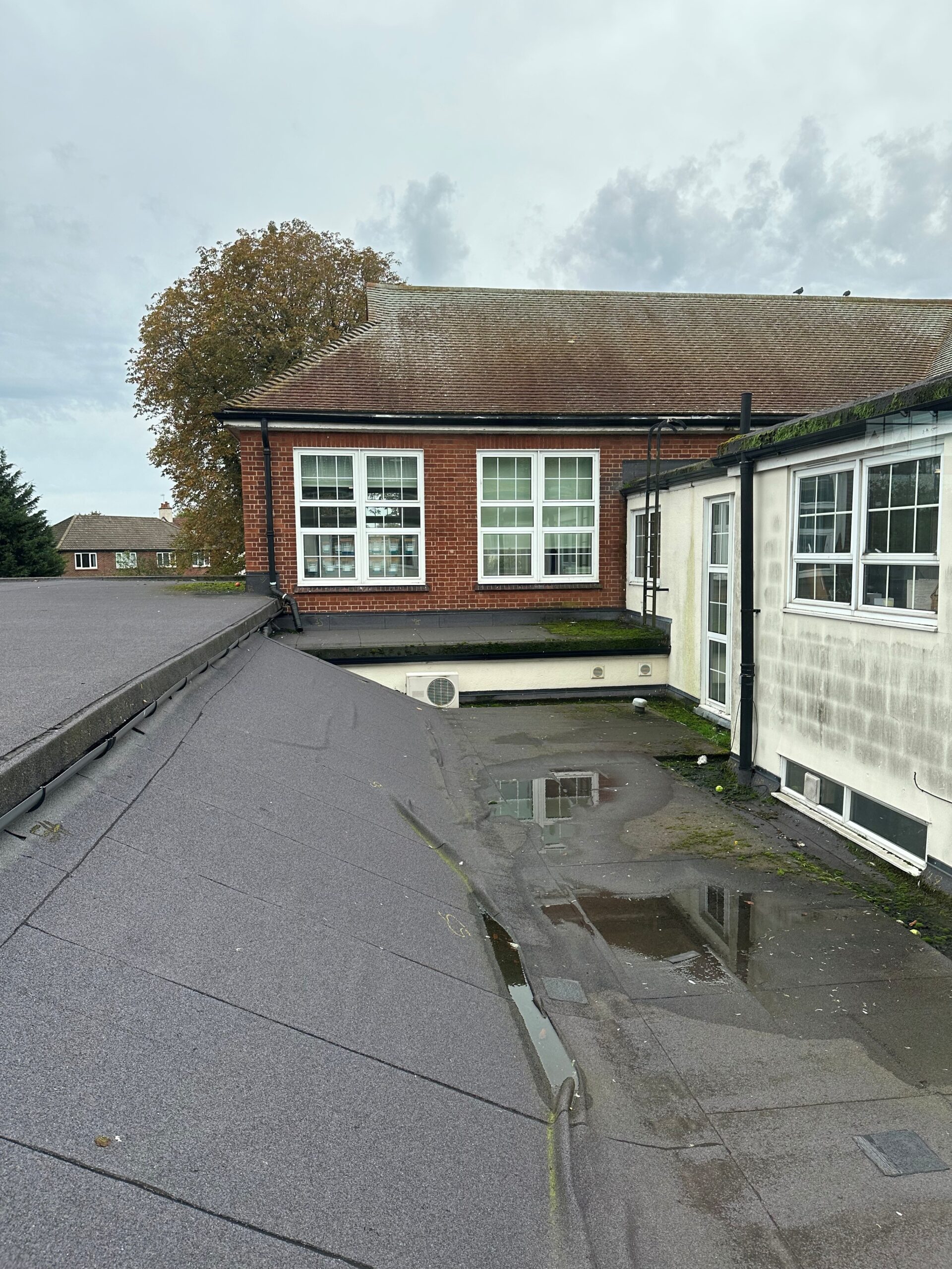 - Flat roof replacement including the strip up of existing and installation of a new tapered insulation triple layer built up system, including replacement of rain water goods and down pipes.